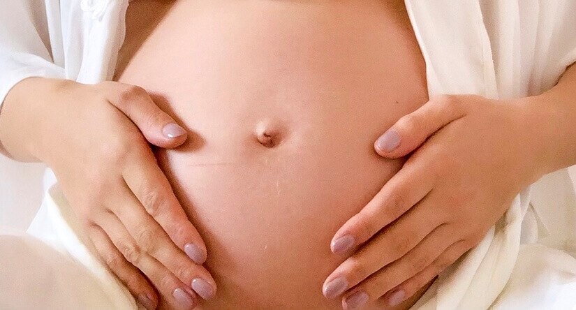 Close-up van een zwangere buik die zachtjes wordt vastgehouden door twee handen, één boven en één onder. De belichting is warm en de achtergrond is neutraal